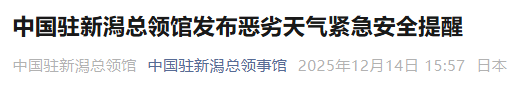 14日,中国驻新潟总领馆发布恶劣天气紧急安全提醒: