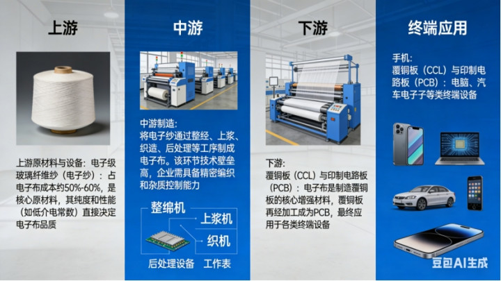 下游:覆铜板(CCL)与印制电路板(PCB):电子布是制造覆铜板的核心增强材料,覆铜板再经加工成为PCB,最终应用于各类终端设备。